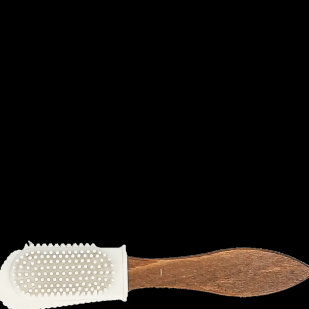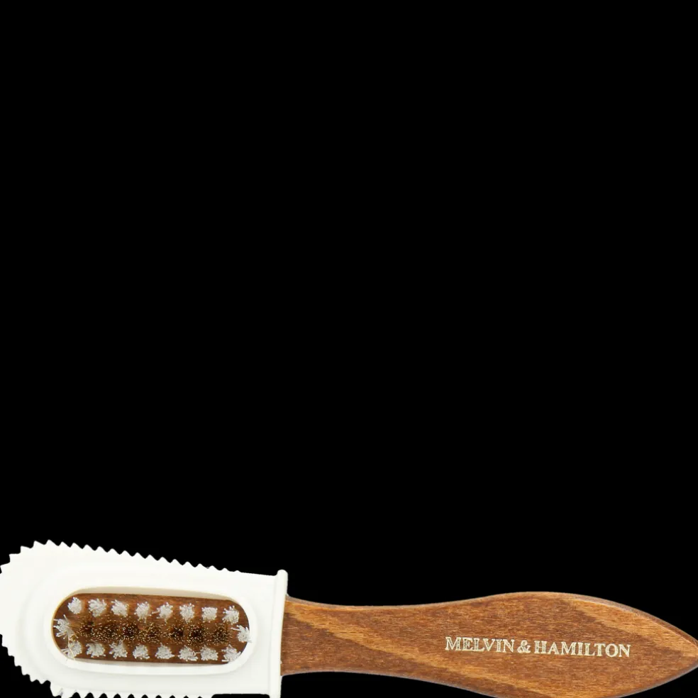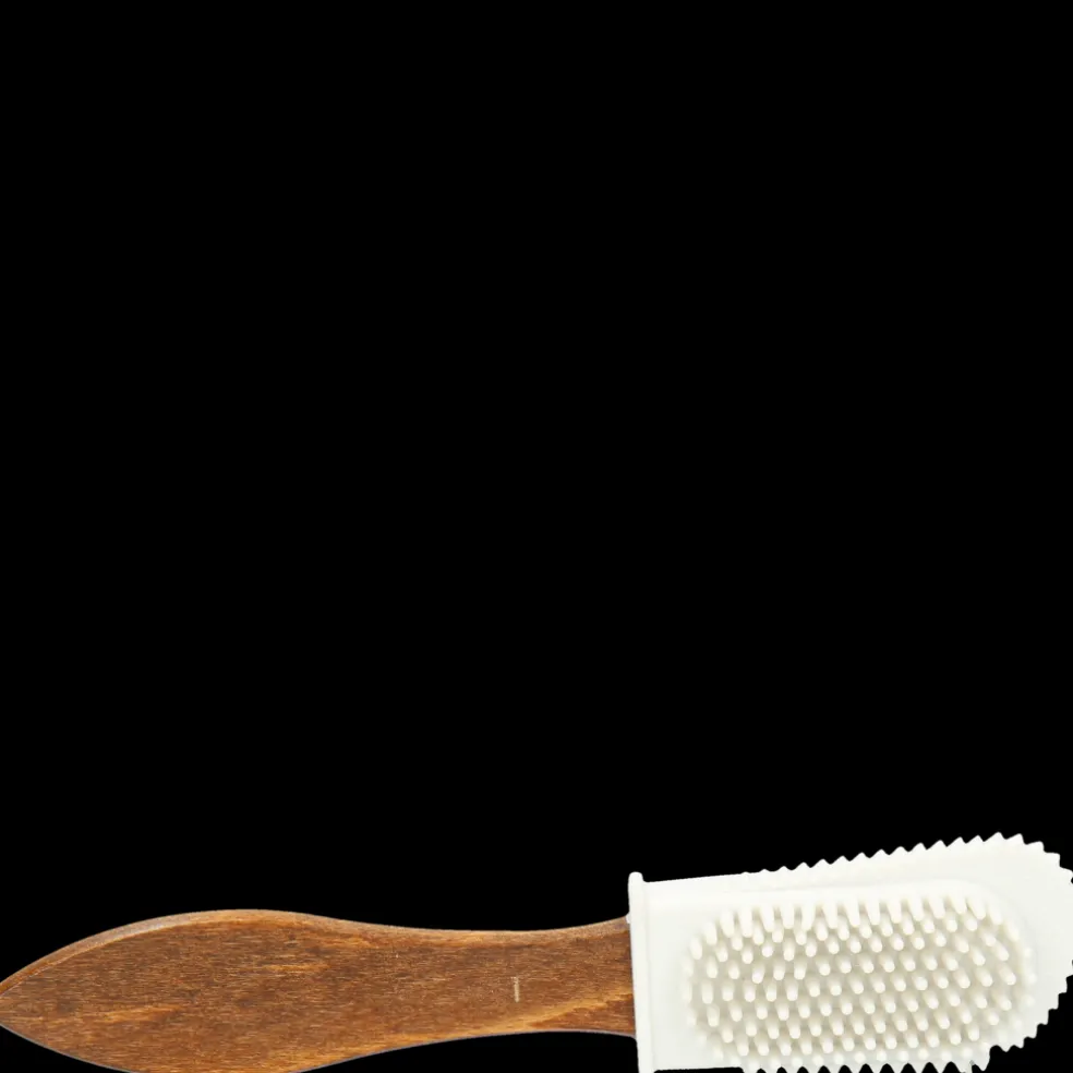 Nasza szczotka Ross 3 typu “2 w 1″ jest idealna do czyszczenia obuwia z zamszowej skóry oraz nubuku. Mosiężna część z włosiem służy do szczotkowania zamszu we wszystkich kierunkach w celu usunięcia kurzu między włosami. Z kolei druga część z gumową główką pomoże Ci uporać się z fałdami i delikatniejszą skórą. Jej uchwyt z chropowatego drewna pozwala dobrze chwycić szczotkę w celu przeprowadzenia precyzyjnych ruchów czyszczenia. Dzięki szczotce Ross 3 Twoje buty odzyskają intensywniejszy kolor i dłużej zachowają nieskazitelny wygląd.