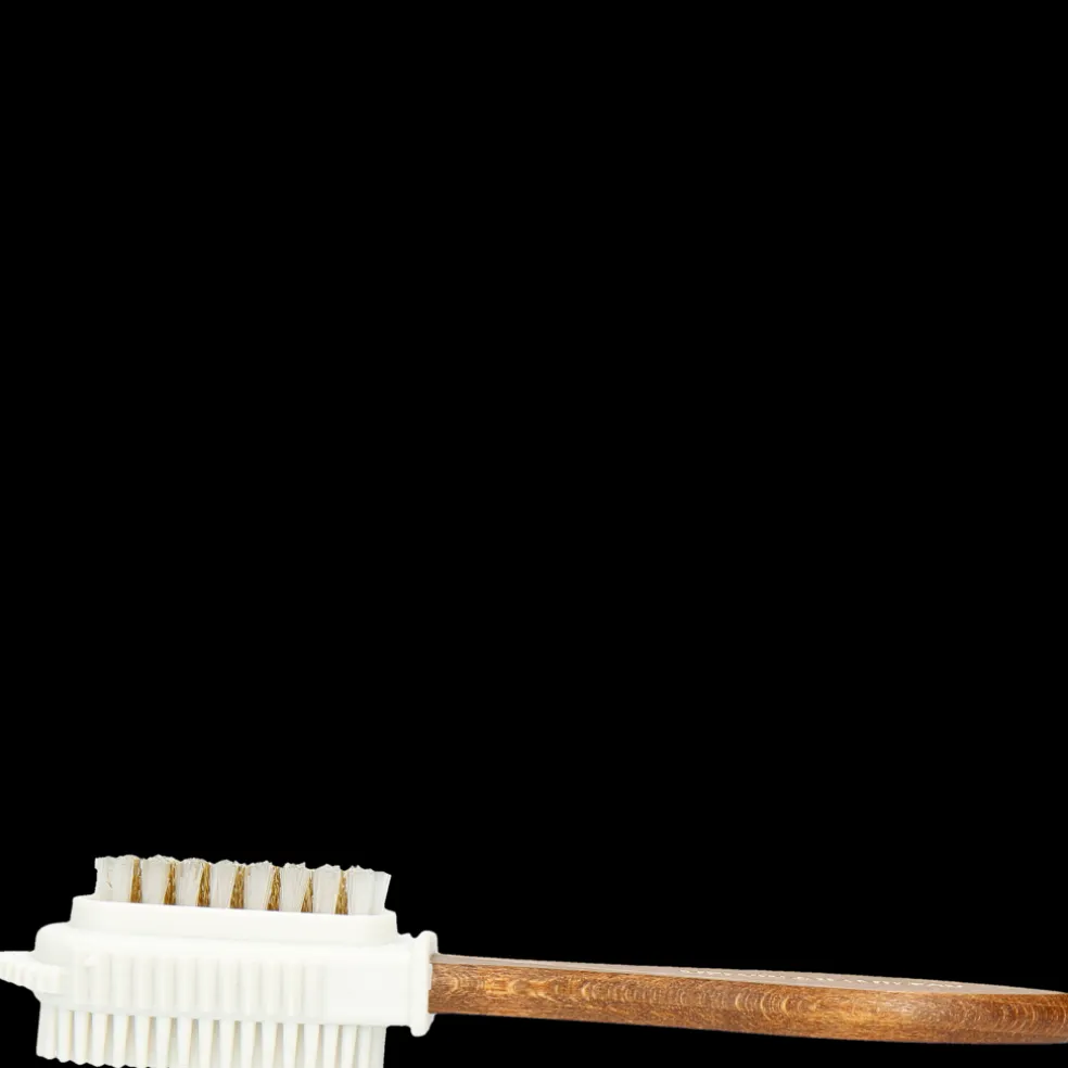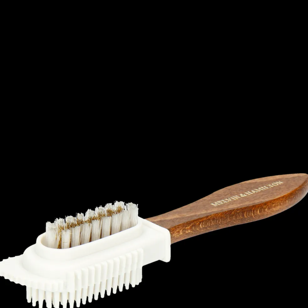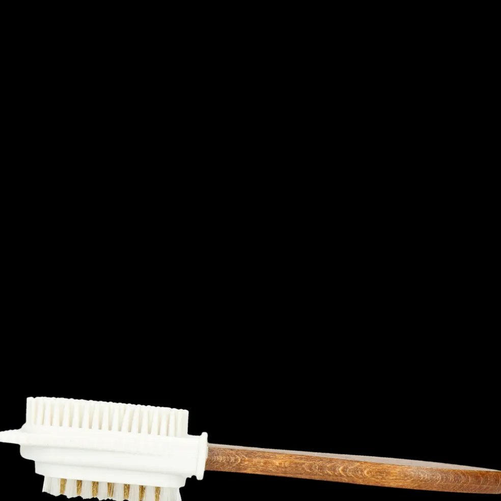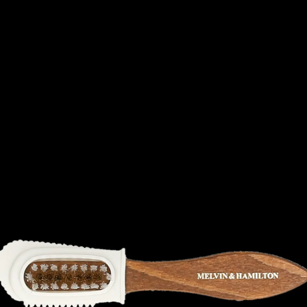 Nasza szczotka Ross 3 typu “2 w 1″ jest idealna do czyszczenia obuwia z zamszowej skóry oraz nubuku. Mosiężna część z włosiem służy do szczotkowania zamszu we wszystkich kierunkach w celu usunięcia kurzu między włosami. Z kolei druga część z gumową główką pomoże Ci uporać się z fałdami i delikatniejszą skórą. Jej uchwyt z chropowatego drewna pozwala dobrze chwycić szczotkę w celu przeprowadzenia precyzyjnych ruchów czyszczenia. Dzięki szczotce Ross 3 Twoje buty odzyskają intensywniejszy kolor i dłużej zachowają nieskazitelny wygląd.